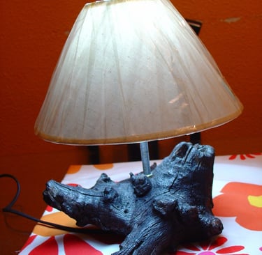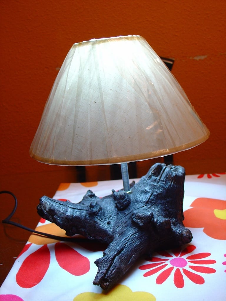 Para su transformación final, le realicé un agujero con precisión, lo justo para permitirle albergar una pantalla y el cable de una lámpara. Así, este antiguo tocón que una vez flotó sin rumbo, ahora ilumina un nuevo espacio con su presencia.